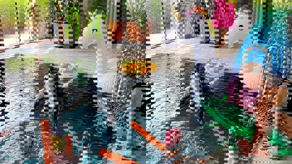 Vi fylder poolen med alverdens badedyr, så der kan brændes krudt af med fri leg i et par timer.