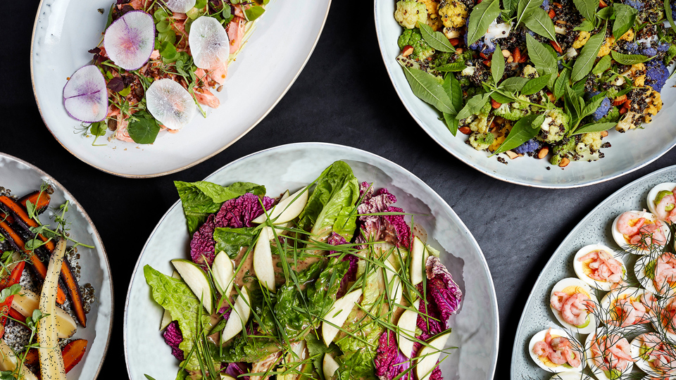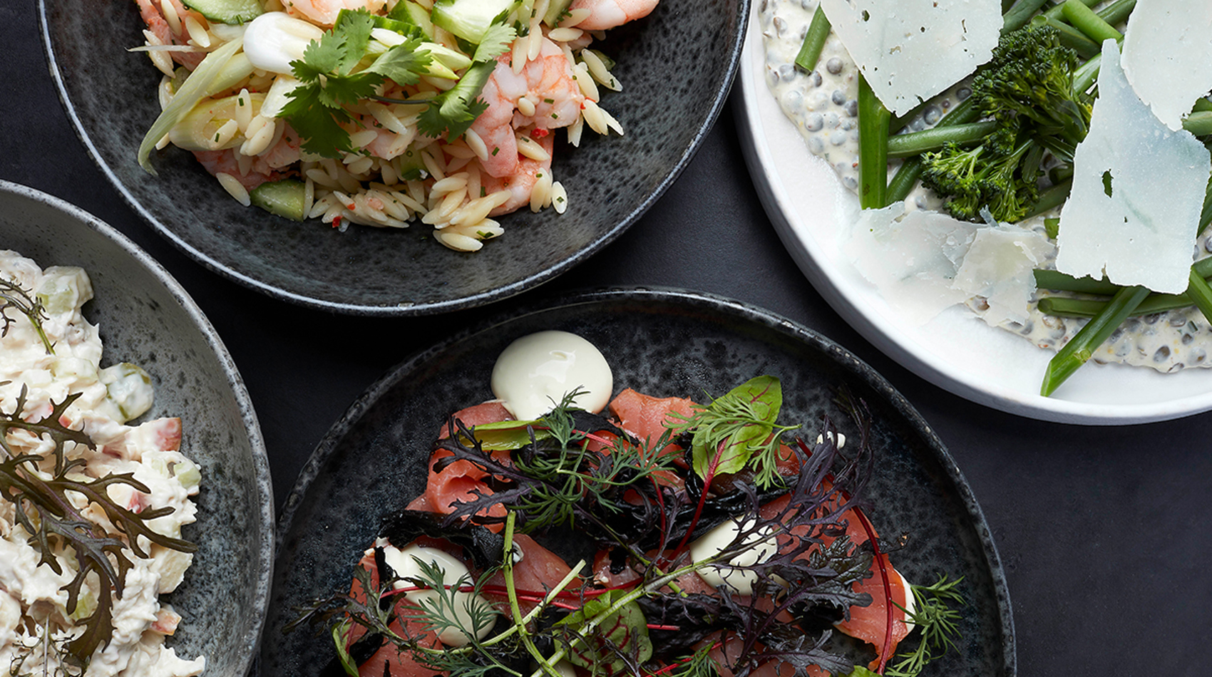 Varmrøget laks fra egen rygeovn (avocadocreme, bipollen, ræddiker, urtesalat og ristede solsikkekerner)
