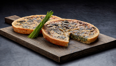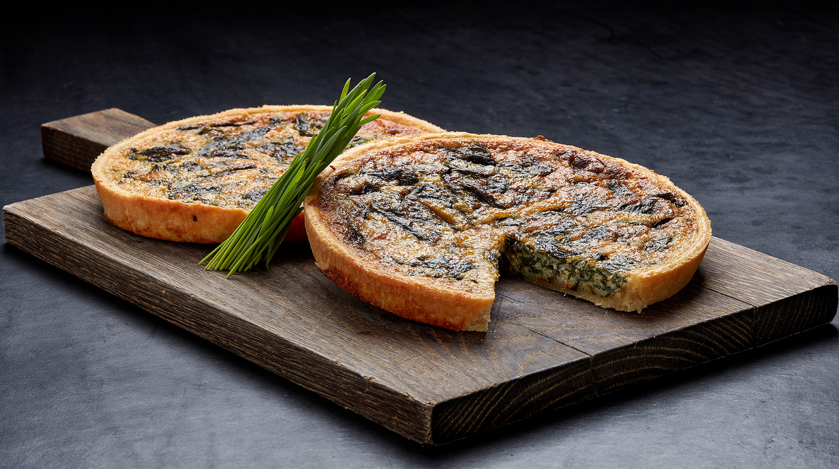 Løgtærte (fermenteret hvidløg, timian, hvedegræs og spinat)