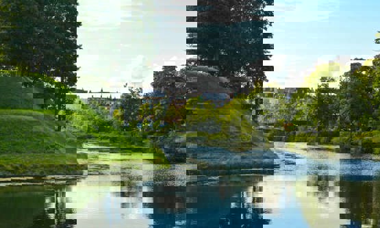 A lovely green courtyard and patio, surrounded by various grass species, beautiful trees, small path systems and a nature playground. When the weather is warm, many guests sip a welcome drink or enjoy a cup of coffee in the garden, which was designed by SLA Architects and is perfect for short strolls and small breaks.