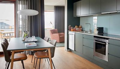 Our 44 hotel apartments in The Garden were inaugurated in 2004, but newly renovated in 2023. The atmosphere is cozy and homely, and the apartments are equipped with everything you need in a home away from home. All apartments have a balcony and you can even check in with your family pet. Restaurant, fitness, pool and patio are just an elevator ride away.