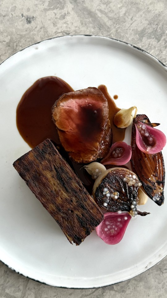 Tender beef tenderloin bound and roasted with fragrant herbs. Served with a rich demi-glace and a luxurious Pommes Anna infused with shiitake mushrooms and a warm hint of Szechuan pepper. A variation of grilled onions with elderflower caviar completes the dish.